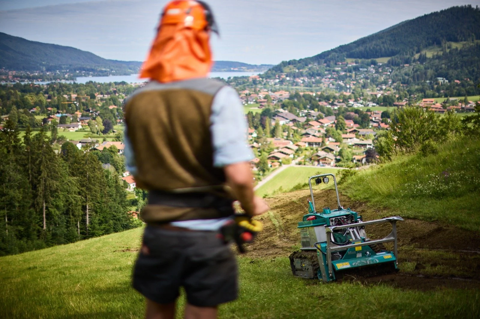 Dank Vinzenz Höß und seiner Forstraupe, die hier schonend auch in schwierigstem Gelände es uns überhaupt erst sinnvoll möglich gemacht hat den Wildacker zu fräsen, können wir die mehrjährige Saatmischung von BSV Saaten aus München, die extra für unsere Höhenlage mit Lupine, Hafer, Weizen, Klee etc. zusammengestellt wurde, ausbringen.